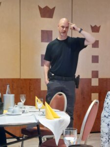 Zuerst stellt Herr Walter sich der Gruppe vor. Er ist Kontaktbeamter, Bereich Prävention, zuständig für Hameln-Bad Pyrmont und Holzminden.